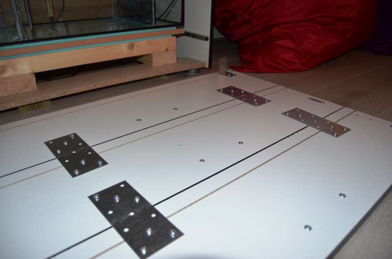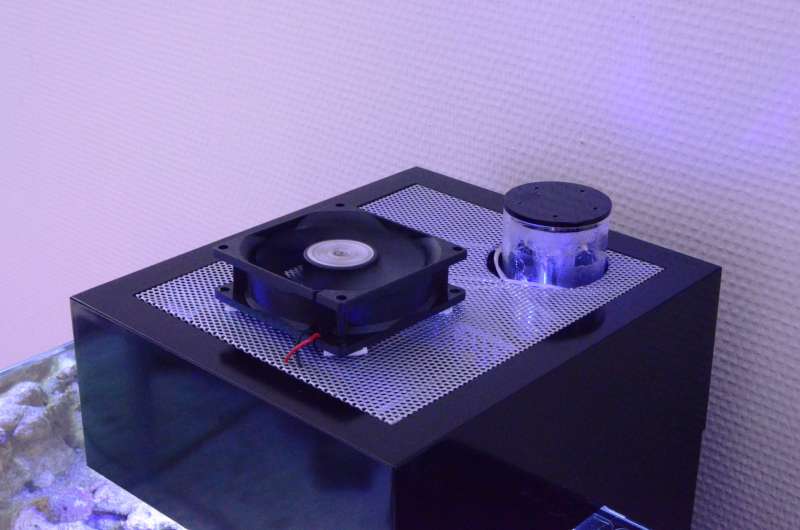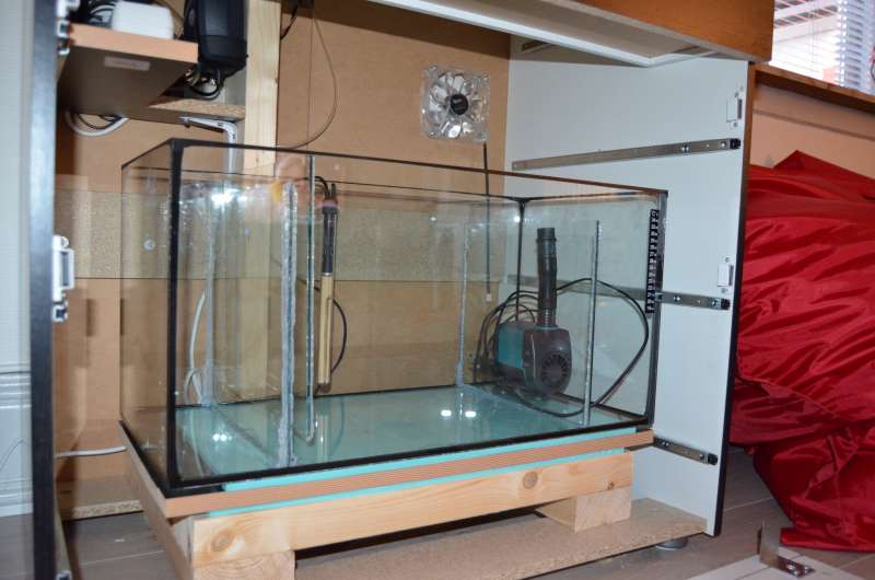 Som det ses her, er det originale LED lys ikke særlig kraftig og der er mange mørke områder, specielt oppe i hjørnerne kommer lyset ikke ud. Derimod kommer de 2 x 3W pærer og 10W Royal Blue helt ud i hjørnerne, og giver et meget kraftigere lys. De hvide og blå kan tændes individuelt. P.t har jeg lagt en blæser løst oven på kassen for at køle den blå en smule, indtil jeg finder en strømforsyning som har lidt mindre power. Skummeren er placeret i hængefiltret og sidder fast med en magnet. Pga. højden af skummeren, er der lavet hul i toppen af lyskassen. For at beskytte lampen er der lavet en lille "splash guard"