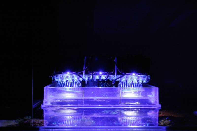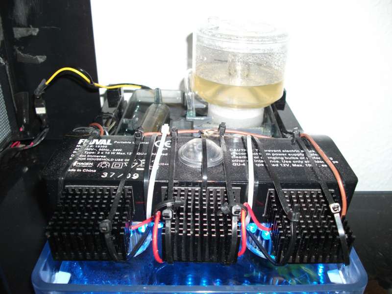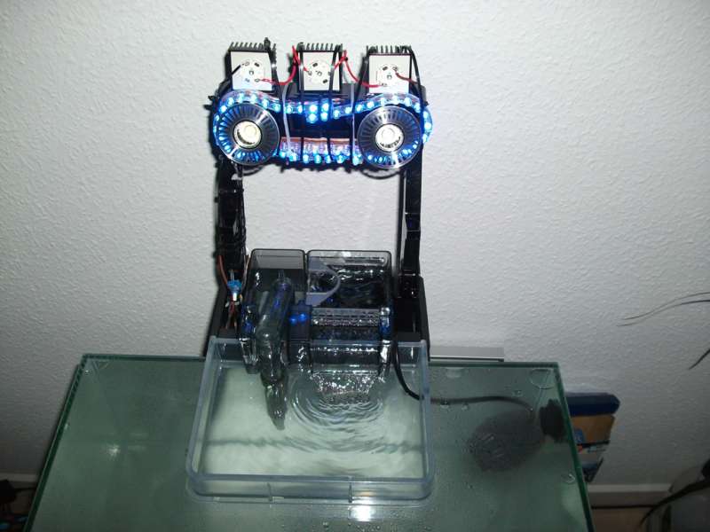 Det hele tilsammen fungerer som primær belysning, som kører i 10 timer dagligt, og som morgen og aftenbelysning er der kun de 2 stk. blå og 1 stk. lilla/UV LED strips tændt.