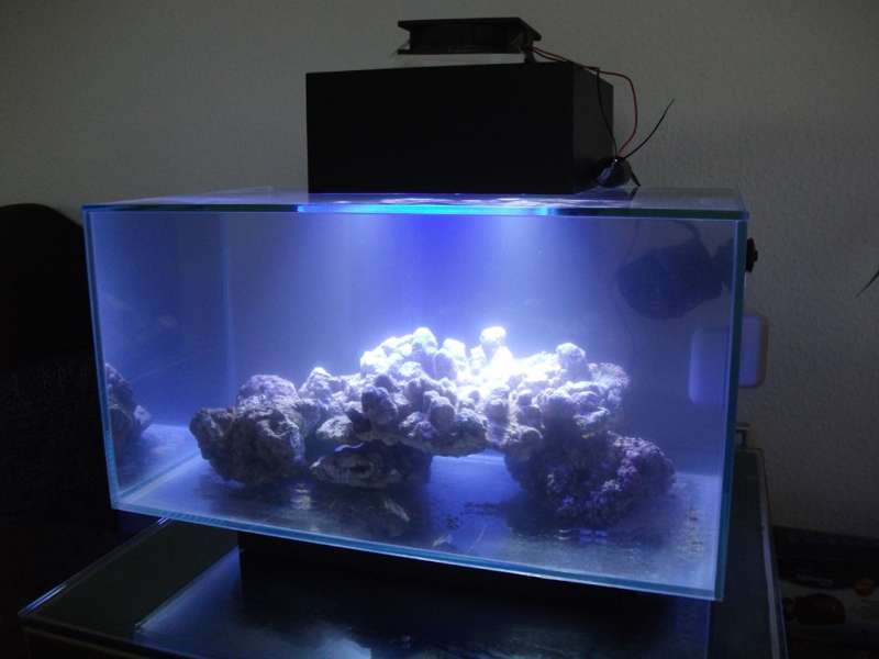 Fra starten af havde jeg ikke tænkt på, om jeg ville have en skummer på sigt, og havde mere planlagt, at jeg ville nøjes med chaeto alger, og så plukke dem, når der ikke længere var plads i hængefilteret. Men projektet kom hurtigt til at indeholde en skummer og en designændring i akvariet. Selv synes jeg ikke det har ødelagt nogen udsmykning at have den lille skummer stikkende op af topdækslet, og jeg ville ikke kunne undvære skummeren den dag i dag.
