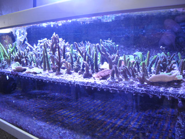 ”Jeg har i virkeligheden to fragmentakvarier. Begge er koblet på samme anlæg som display akvariet. Så det er en stor mængde vand (ca. 2500 liter) der cirkulere rundet imellem de tre akvarier og med samme sump. Jeg har eksperimenteret lidt med forskellige lyskilder, hqi, T5, og LED af forskellige typer. Lige nu har jeg en 250w hqi over den ene fragment akvarium og en 150W led over det andet. Det virker som LED lampen med bl. IR dioder, skaber de bedste vækst og farve betingelser for koral fragmenterne. Jeg får i hvert fald flottere farver på korallerne i denne tank. Det varer nok ikke længe før end HQi lampen over det andet akvarie også bliver udskiftet