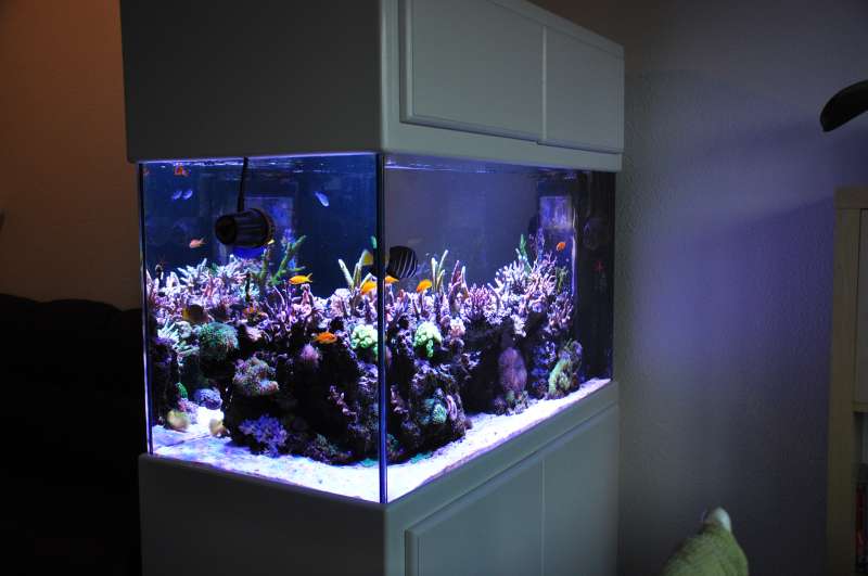 Vi startede ud med et lille 125 liters cubeakvarie - bygget ud af et IKEA køkkenskab, som vi havde i et års tid. Akvariet blev hurtigt alt for lille, da vi fik styr på værdierne, og korallerne derfor begyndte at vokse rigtig godt. Vi har haft vores helt hjemmelavede 275 liters rumdeler akvarie i omkring et lille års tid. Alt er bygget op fra bunden. Vi har selv fuget akvariet sammen og bygget møblet med Monicas far. Jacob har herefter sprøjtemalet møblet i højglans hvid og bygget stensætningen op. Vi har herefter flyttet fisk og koraller over i vores 275 liters. Heldigvis uden at miste noget. Som studerende har vi lavet mange billige løsninger i akvariet og købt / byttet os til de fleste fragmenter. Noget som har været med til at gøre, at vi har haft råd til at dyrke denne lidt dyre, men meget smukke hobby. Kun dejligt når man kan lave ting selv og derved spare lidt.