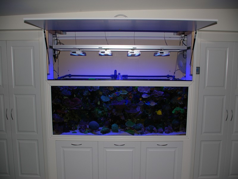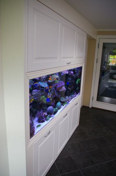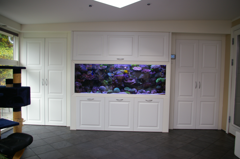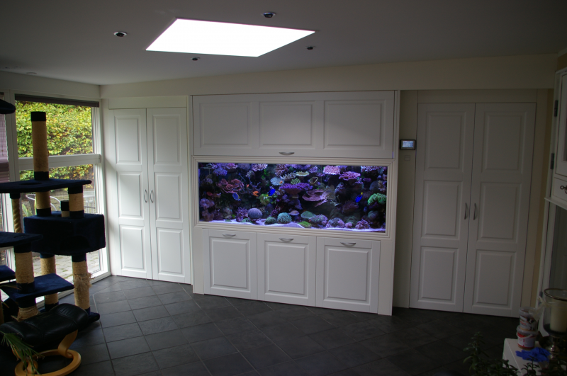 Akvariet er bygget ind i en væg for enden af vores ene stue. Væggen er opført til samme formål med adgangsmulighed i begge sider, under samt over akvariet. Låger er fra Designa Køkken. Alt arbejde er udført af mig selv.