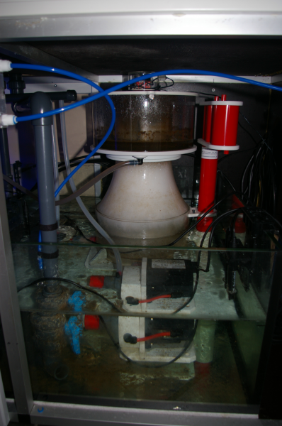 Royal Exclusive Bubble King Supermarines 300. Super lydløs. Den bliver fødet med luft udefra, som bliver filtreret i et stort luftfilter med aktivt kul. Skummeren har automatisk rens af skummerkoppen, og er tilsluttet direkte til kloakken, så koppen kan tømmes via en hane.
