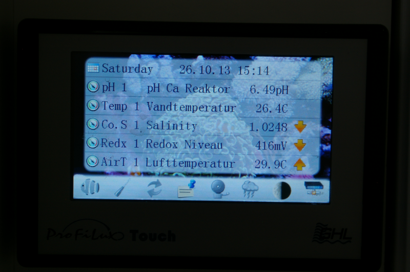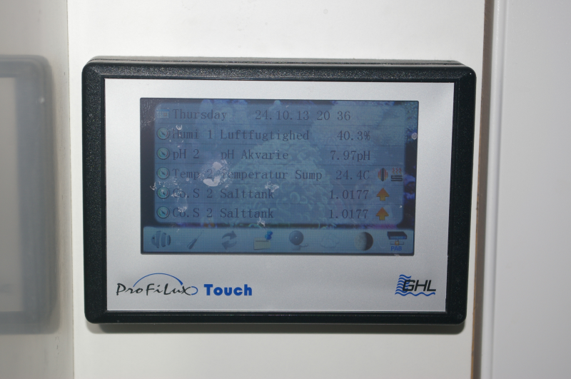 GHL Profilux Touch-panel til betjening og overvågning af systemet. Man kan bl.a. se og justere temperatur, pH, salinitet, redox, starte foderpauser (hele 4 forskellige), starte andre events, f.eks. stoppe skummerpumper (hvis koppen skal demonteres), rense skummeren etc.. Der er næsten ikke den ting, man ikke kan indprogrammere.