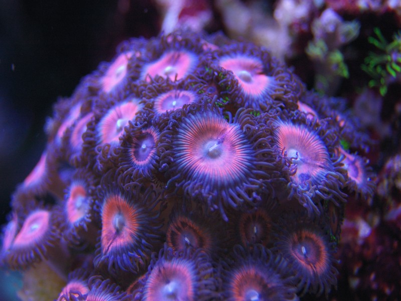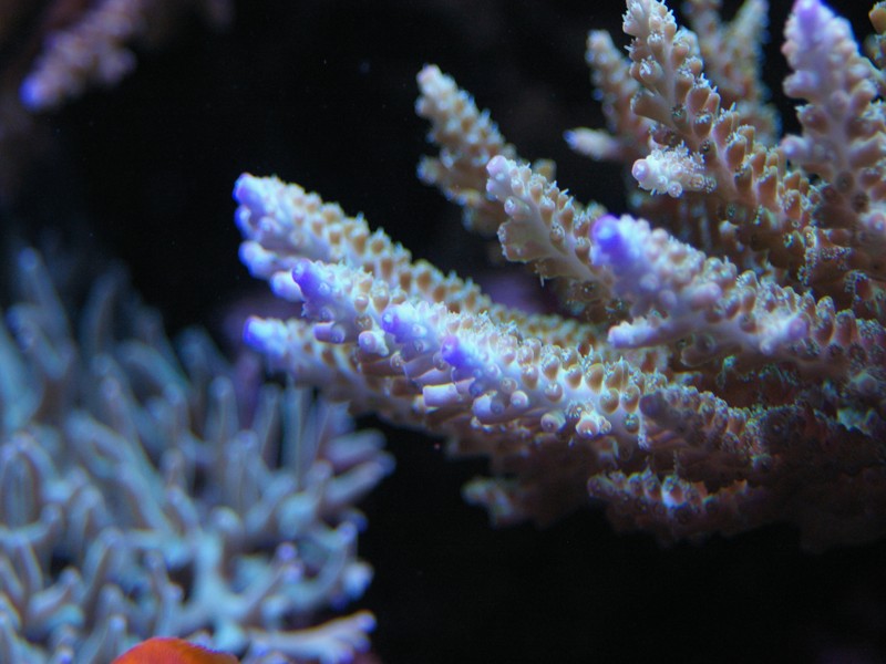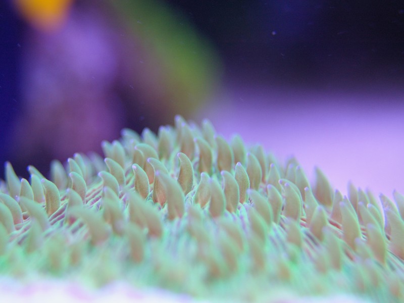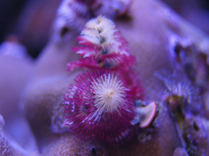 Som dekoration er naturligvis også et mindre antal levende sten, som jeg har beholdt. Mest fordi der lever koraller på. Da jeg startede akvariet op, lagde jeg 50 % af mine levende sten, fra det tidligere akvarie, ned blandt keramik søjlerne for at seede akvariet med min eksisterende biologi, men disse er efterhånden taget op alle sammen.