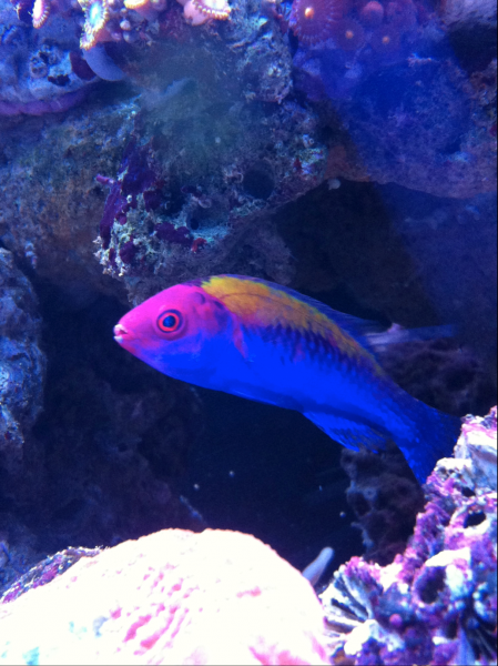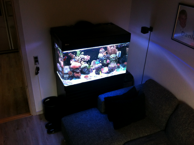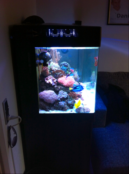 Jeg har haft akvarium i 5 år. Mit første akvarium var 45 liter, og der havde jeg en fed slørhale til at tulle rundt. Der gik et år, og da en ven til mine forældre skulle af med et 250 liters Aquastabil slog jeg til. I dette akvarium havde jeg en masse malawicichlider, og 2 år efter købte jeg mit første saltvandsakvarium. Det var et Aqua Medic Blenny, som jeg fik en god pris på nede ved Janus i Tropeland. Han guidede mig igennem opstarten og henviste til saltvandsforum, hvor han mente, at jeg skulle læse en masse, inden jeg overhovedet tænkte på at komme fisk i! Jeg fik snøvlet mig igennem en længere opstart, og akvariet begyndte at køre godt med en Chrysiptera (svensker) og et par Ocellaris. 1 år efter havde jeg overtalt mine forældre til, at det var tid til at opgradere til mit nuværende RSM 250, der har kørt omkring 11 måneder nu.