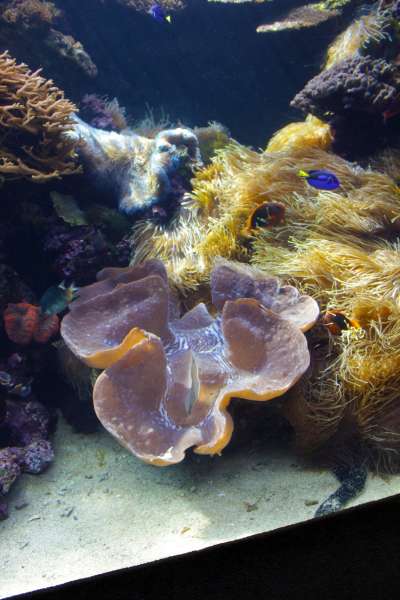 Med muslinger på hjernen vil jeg fortælle lidt om de store muslinger de har i et 21.000 liters akvarium indenfor. Dette akvarium kalder de "The Barrier Reef" da det skal efterligne et miljø nær Australien. Akvariet er PROPPET med koraller i alle mulige farver, men det der nok får de fleste til at spærre øjnene op, er de kæmpemæssige Tridacna Gigas de har liggende ved bunden. I følge dem selv er det sandsynligvis verdens største og ældste muslinger i fangeskab i hele verden. Jeg selv stod og måbede da den ene musling lavede et ordentligt ryk i det jeg gik forbi. (Jeg var næsten alene på stedet da vi lige nu er uden for turistsæsonen). Verdens største eller ej - de var ENORME! Og den største vejer mere end 77 kilo!
