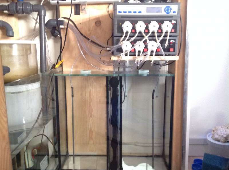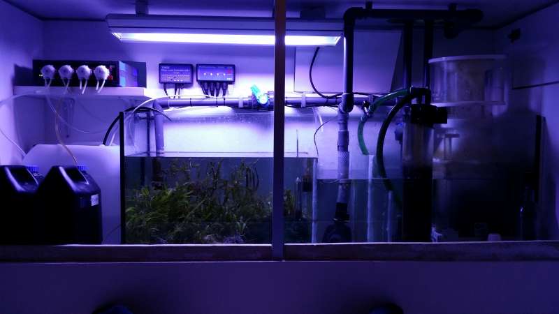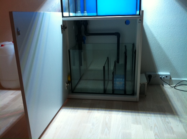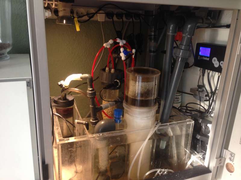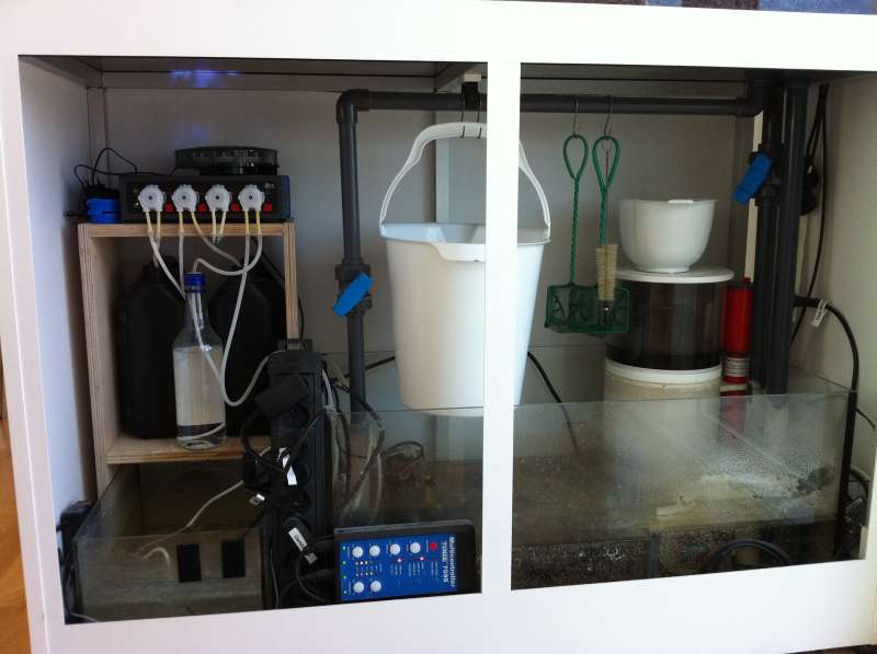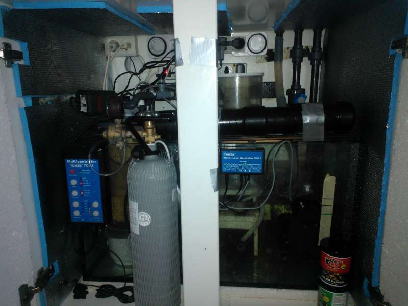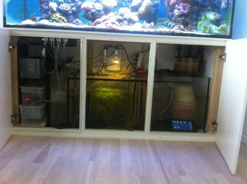 Her er et af min -som passer mit 300 liters sps og lps display- med en Korallin 1501 kalkreaktor, 36 w UV filter, Skimz sm121 skummer, Tunzemulticontroller til cirkulationen, Tunze level control, Et par tænd sluk ure til at styre HQI lys og blæsere og endelig en Tunze silence 2400 liter til returen.
