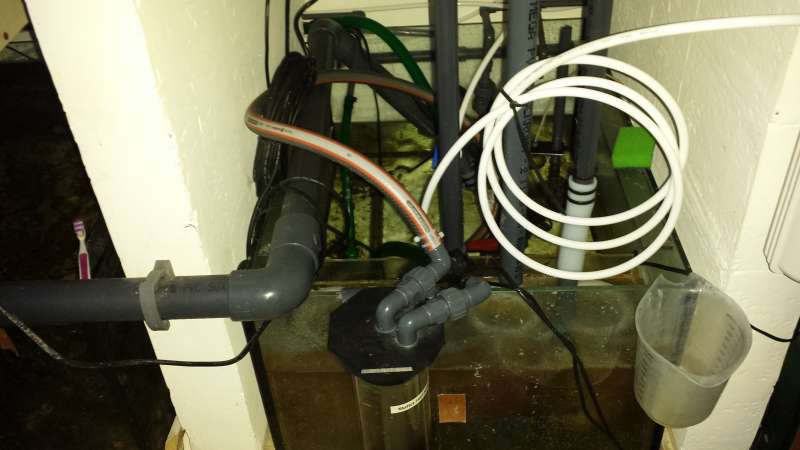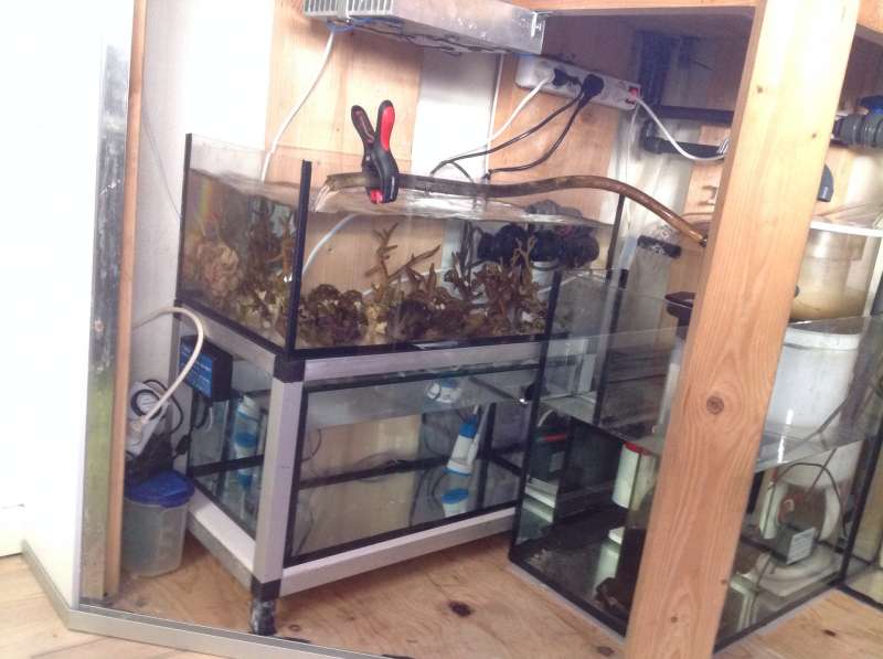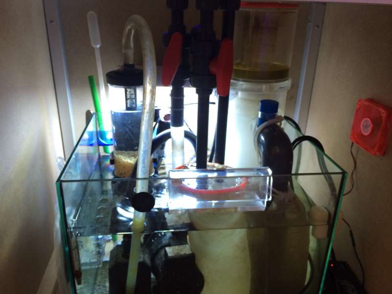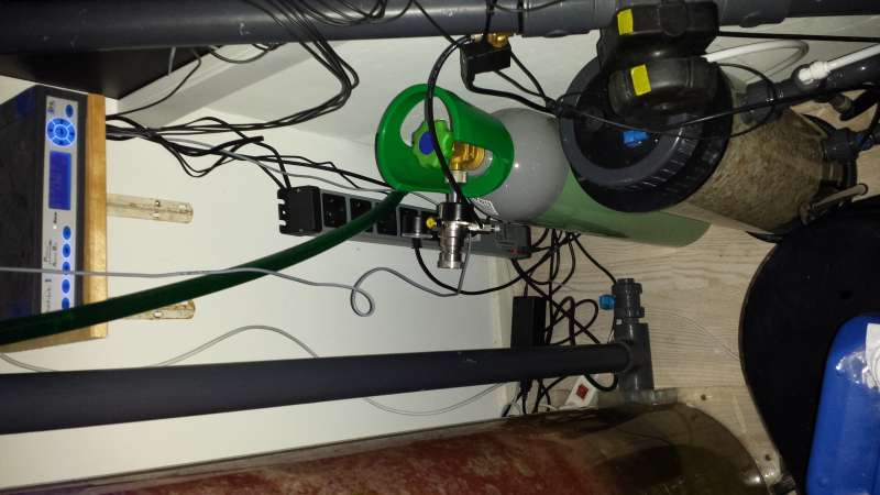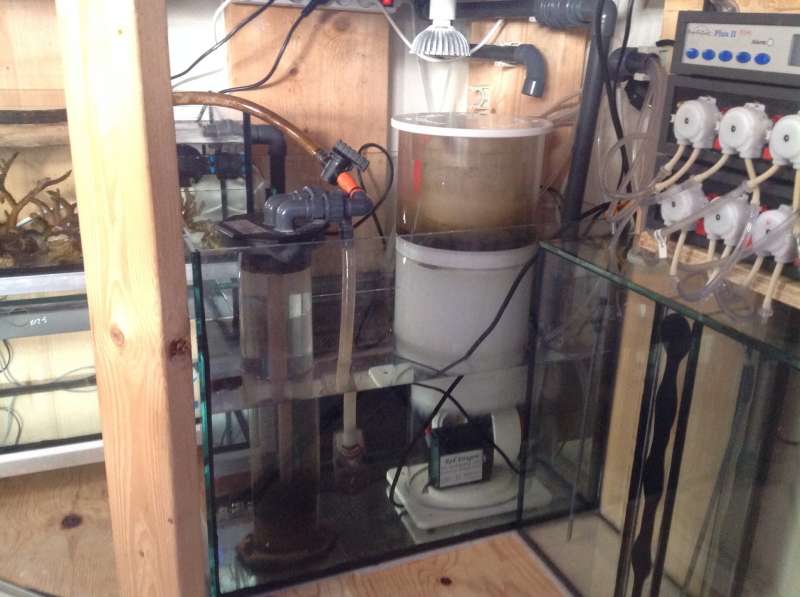 første tank indeholder 160 L osmosevand til efterfyldning. Anden tank også en 160 Liters men dette er vores primære sump hvor der bliver sendt vand til skummer og gennem filter og alt kommer retur og tilbage til akvariet. skal dog på sigt laves lidt mere om, da den del kan gøres beder og mere optimalt. sidste tank er også et 160 liters akvarie som pt. bliver brugt til fiske pasning, men som på sigt skal blive en del af sumpen og rense systemet. skummer lidt for stor til at stå under systemet 220cm høj og 40cm i diameter fødes med ca.2000 liter vand i timen og med ca. 8000 liter luft. Grotech HCR 200 kalkreaktor med 6kg flaske. sådan kan en sump også se ud når der ikke er plads under ens system, og det har fordel og ulemper, men muligheden for hele tiden at bygge vider på det, som der kommer nye ideer.
