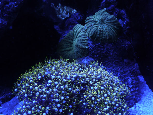 Så er det vist på tide til en update. Et år er gået siden opstart, og en masse erfaring og koraller rigere - og en masse penge fattigere er det endelig blevet et lille, fint hyggeakvarie med en blanding af hovedsageligt blødkoraller, men lidt sps og lps er det da også blevet til - og det hele trives umiddelbart. Vandskift 10% hver uge og manuel, daglig tilsætning af calcium, magnesium og kh buffer - ingen sporstoffer tilsættes :wink: