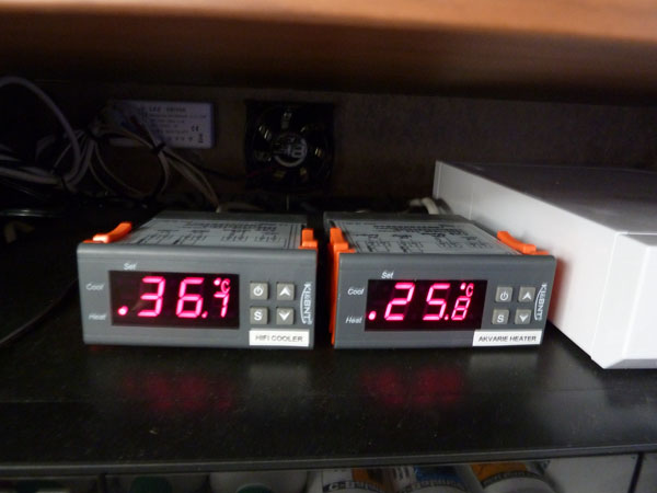 Temperaturstyring til hhv. hifiskabet som står ved siden af akvariet, og varmelegemet. Sidstnævnte bliver først aktuel til sommer, da det pt kører 24/7 for at holde temperaturen oppe