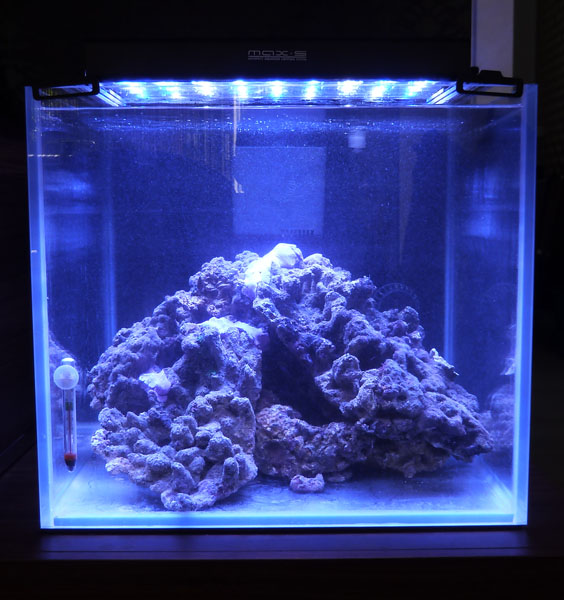 MaxSpect 110W LED med hjemmelavede beslag. Fint til prisen, har 2 kanaler for hhv hvidt og blåt lys, indbygget timer mv. men er dog ikke dæmpbar og med sunrise/sunset effekt som de noget dyrere Pacific Sun