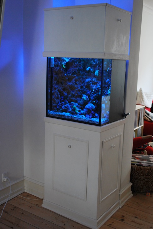 Og det er fatisk det. Skabet er hjemmelavet i 90 cm højde samt 40 cm lyskasse. Det giver en samlet højde på lige under 2 meter. Jeg er gået efter et akvarie som er højt og fungerer lidt som et møbel/montre med masser af lys i hele spisestuen. Det er virkeligt flot i den højde, men det er jo smag og behag. Yderligere er skabet måske lige lovligt pyntet med lister og den slags, men da vi har mange øvrige møbler i samme stil passer det ret flot ind synes jeg selv. Igne smag og behag. Lyskassen skal laves om da den dels blev lidt skæv og desuden er lidt for høj. Højden er dog smart da den dækker diverse ledninger og teknik godt.