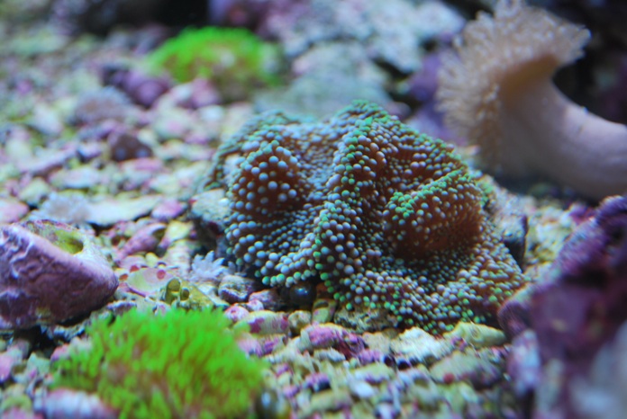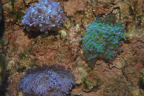 I sumpen har jeg cirka 10 kg sten og i akvarium cirka 15-20 kg. Der er en del skiveanemoner, polypper, sarcophyton samt Caulastrea og flere typer af Euphyllia monteret på baggrunden. Har lavet et par forsøg med SPS, som ikke er gået så godt. Alle øvrige koraller trives meget fint, pånær nogle skiver som har haft lidt svært ved at tilpasse sig det nye lys.