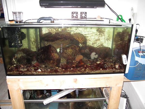 og teknikken, til højre er køleren fra Boyu, har lige sat altankølingen til istedet, 40 meter slange ud gennem væggen og til altanen i efterår, vinter og forår er nok til at holde det under 18 grader. Lys er en 150 HQI plus et 24 w lysstofrør i sumpen. en 6000l/t tunze til cirkulation og en aquabee 3000 fra sump - skummeren er en tunze nano, den store er i stykker, men der skummer ikke ret meget af alligevel.