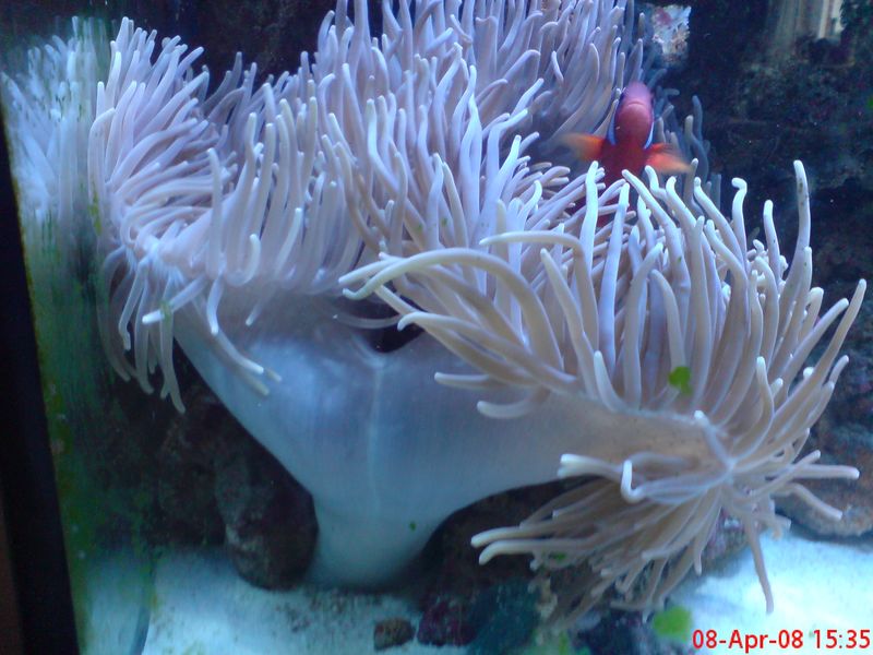 hej folkens ville lige poste et par billeder af min store anemone som er ved at dele sig. kom hjem fra arbejde og mødte dette dejlige syn. min kæreste sagde at vandet var blevet hvidt på et tidspunkt, kan dette skyldes anemonen? vandet er klar igen og fiskene ser ud til at ha det fint.