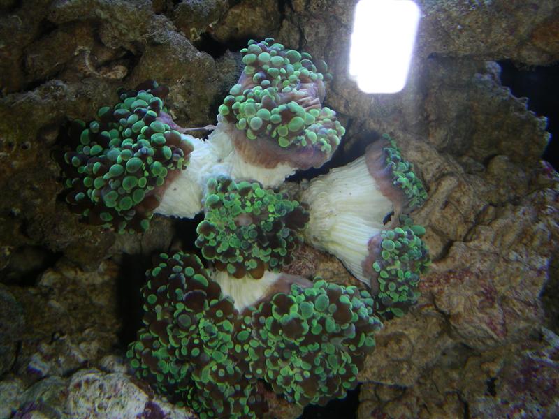 Har desværre ikke et godt billede endnu, men min ene 'anemone' - en Euphyllia paradivisa tror jeg (efter længere tids søgen på nettet) at det er - ser ret sløj ud. Den har lidt brunt slim som hænger løst i gardiner omkring skelettet og alle grene er trukket kraftigt sammen og ser ret slatne ud. Den er også begyndt at smide dens små nærmest selvlysende grønne hoveder af.