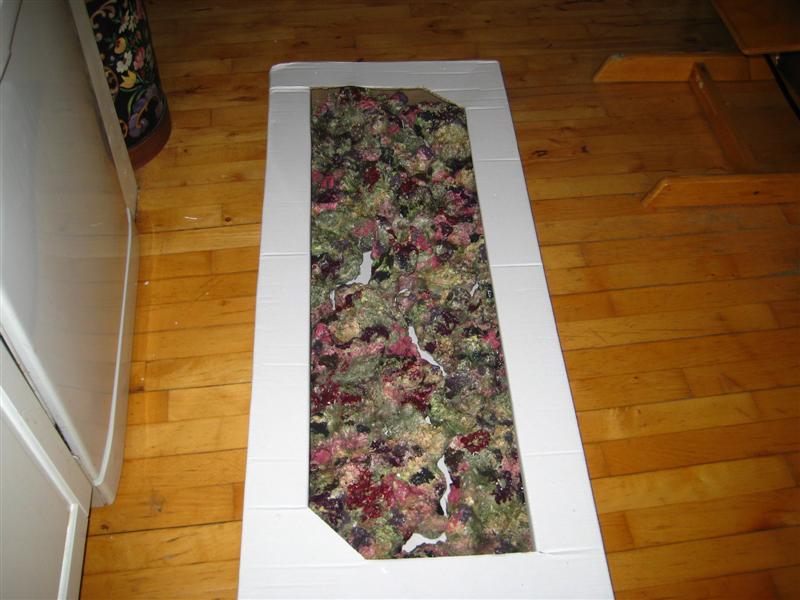 Der kom vand i, og vi genbrugte de små sten fra vores RSM (ca. 30-40 kg), og købte en fed "kunstig" Reef baggrund importeret fra England (se billeder), som vi desværre ventede lidt længe på, men den røg i da den endelig ankom, og nu skulle det så bare stå og køre ind, og gennemgå de algefaser der skulle til.