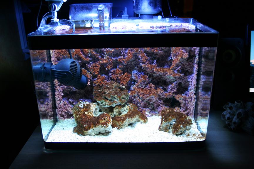 Akvariet er lavet af Jens-Jørgen og er på ca. 35 liter. Det er mit første saltvandsakvarie, har dog haft ferskvand i over ti år. Jeg har det sidste år læst diverse opstarts og begynder artikler om saltvand på nettet, samt læst bogen Reef Secrets.