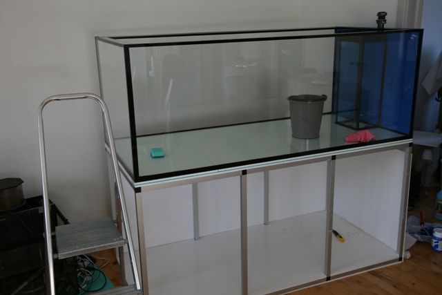 Vi har haft lidt småproblemer under opstarten med stabiliteten af bordet, som vi til slut fandt ud af skyldtes et defekt vatterpas. Stol aldrig på vands evne til at være vandret! Nå, men vi har fået et par massive plader under bordet, og under akvariet, og derudover er vi igang med at få det hele helt op i vatter ved hjælp af et par tynde plader der skal ligge nederst.