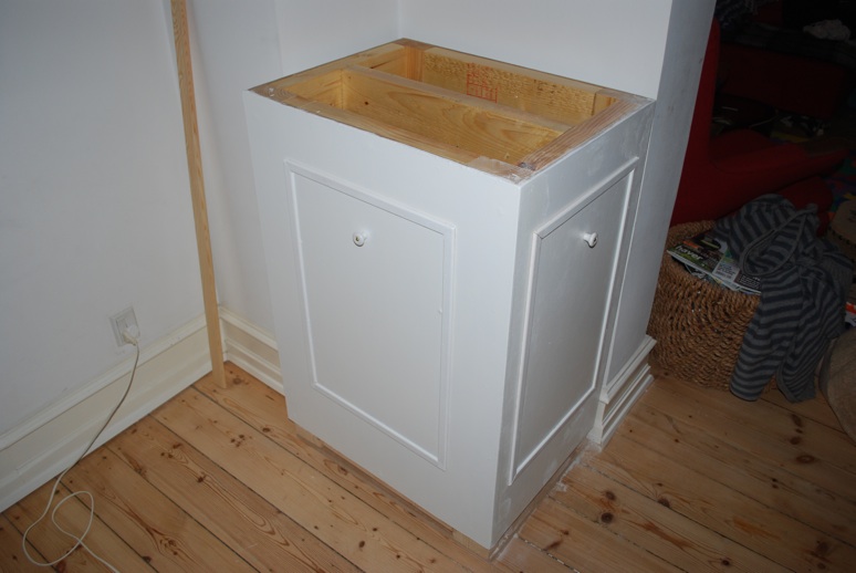 Jaeh tjoeh. Ja altså, jeg er meget forsigtig ved det her da det er en gammel lejlighed og der er gamle gulve. Jeg må lige smide et par billeder af rammen til underskab så I kan se hvad jeg mener. Idéen var, at den skulle hvile på tre af hjørnerne (to af siderne) på væggen, og så et sidste ben. Men her blev jeg bekymret for, om gulvet ville give sig lige så snart der kom vand i. Eller rettere, det vil det helt sikkert. Jeg er sikker på at bordet ikke kommer til at vride da det er bensolidt bygget. Det er bygget med 95x45mm brædder. Det skal nok holde