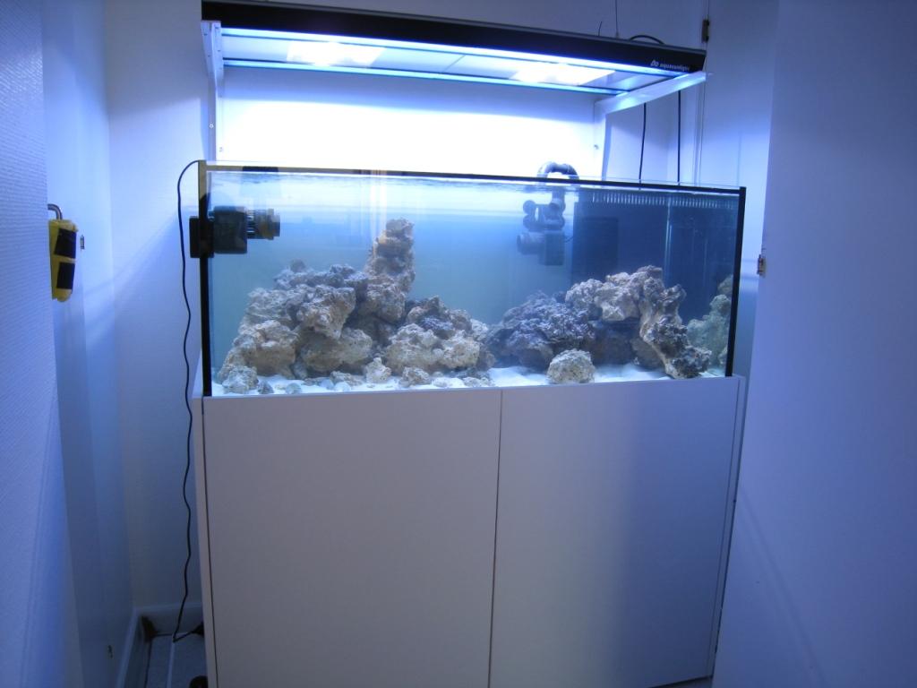 Jeg startede op med 100 liter indkørt vand samt 8 kg indkørt levende gros og 12 kg LS af høj kvalitet og 19 kg kunstige levende sten. Over akvariet har jeg et aquamedic NG 2x150 w HQI og 2x54 w T5. Jeg bruger en Deltec APF skummer som fungere rigtig godt og denne skummer kan klart anbefales til andre