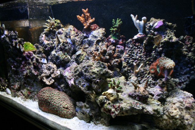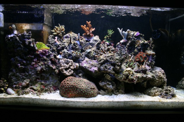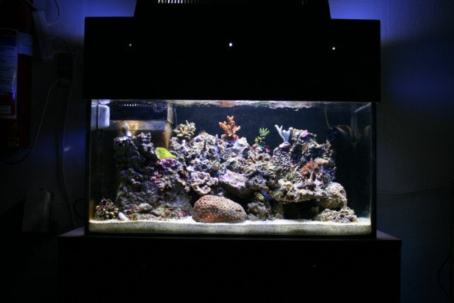jeg har ingen fisk i akvariet og jeg ved heller ik om jeg vil have nogen i, kan ikke helt bestemme mig. der er dog en enkelt Kamel reje (Rhynchocinetes durbanensis) 1 ( Calcinus sp ) 2 turbo snegle og en enkelt Acropora krabbe. det er hvad der er af liv i akvariet udover alle korallerne