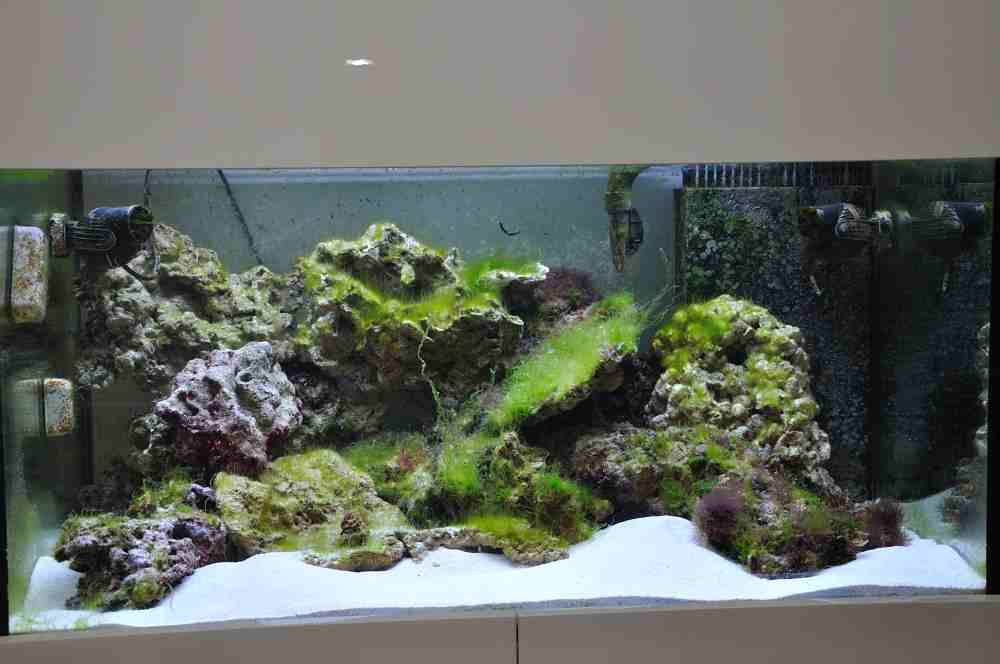 IKS Vario 3 plus Der er ingen baggrund i akvariet da min Juwel baggrund (sad i akvariet da jeg købte det) valgte at gå løs da saltvandet var blandet og fyldt i akvairet