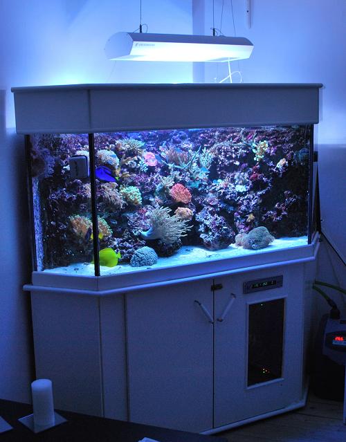 Akvariet er et 490L Hjørneakvarie med panorama front. Der er ca. 80 cm. ind til overløbet fra fronruden:)