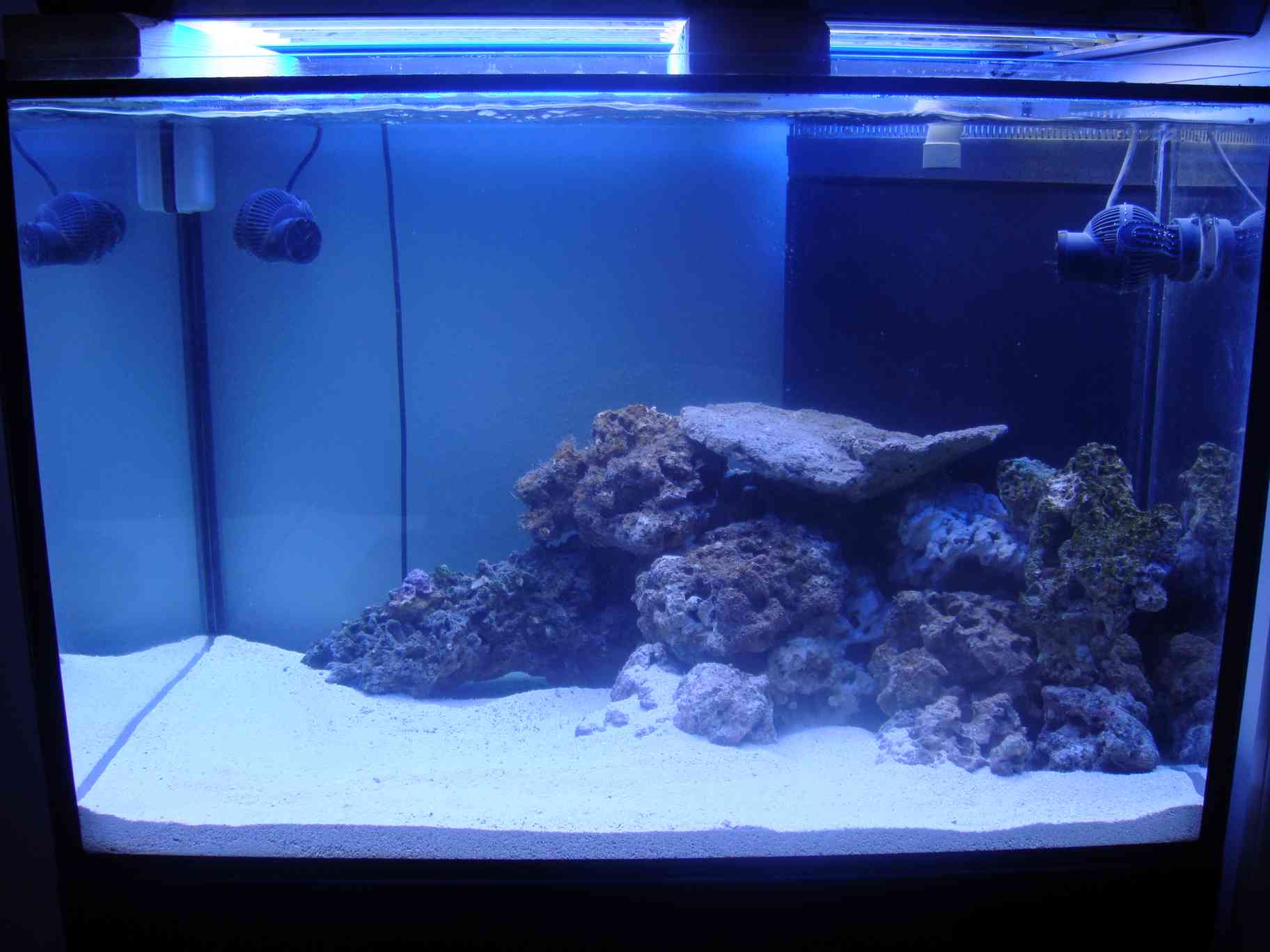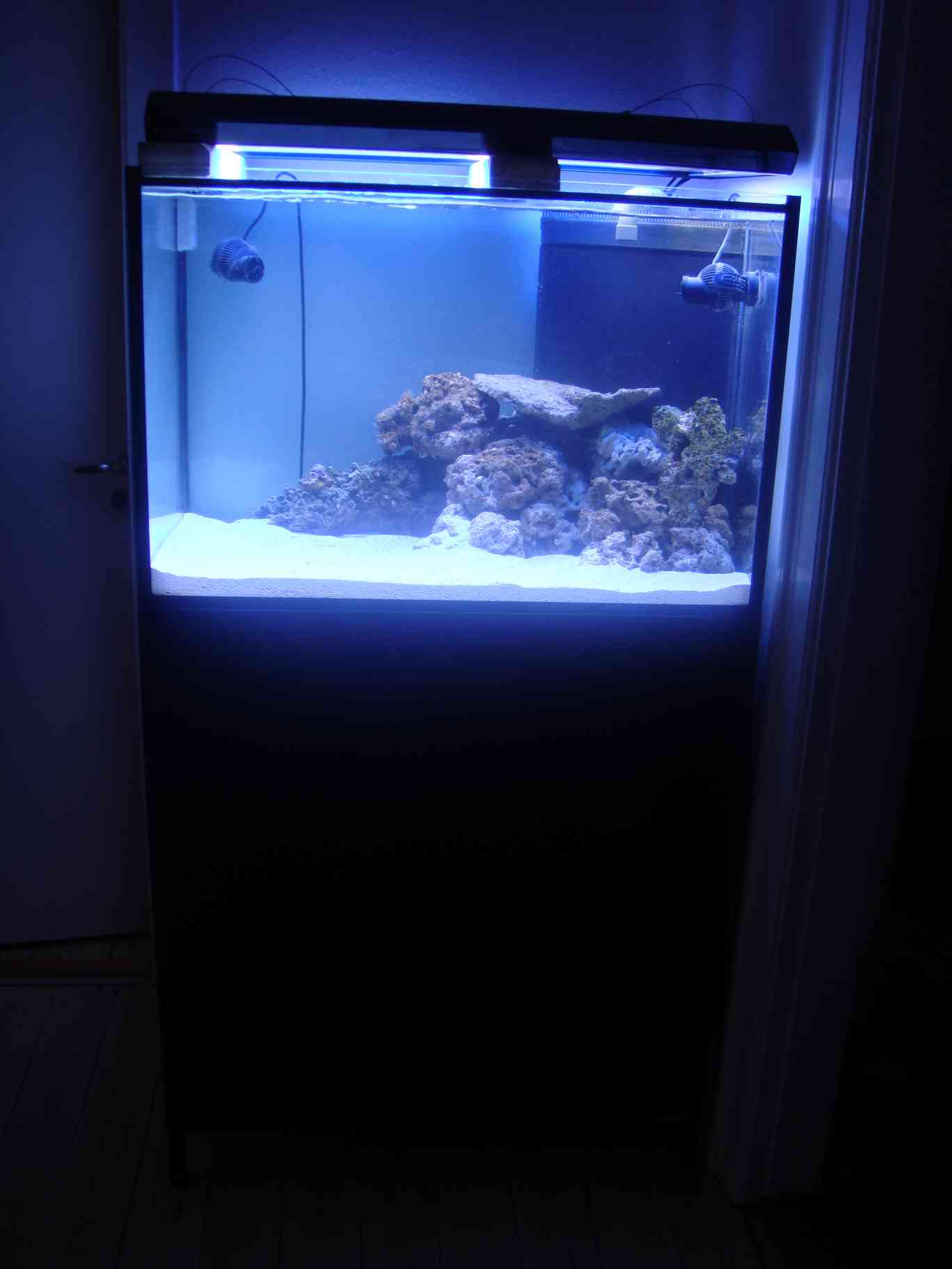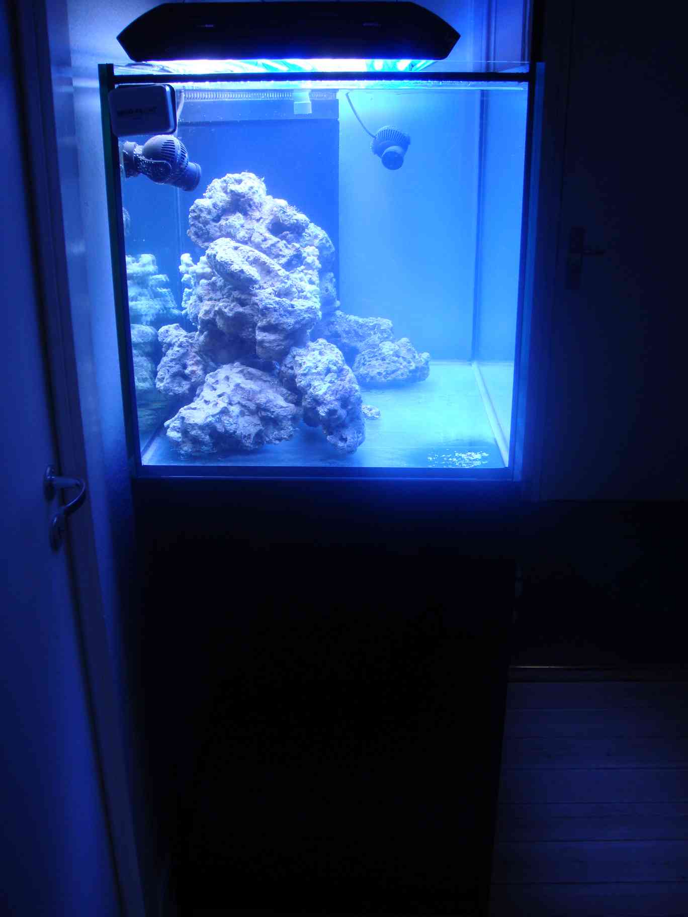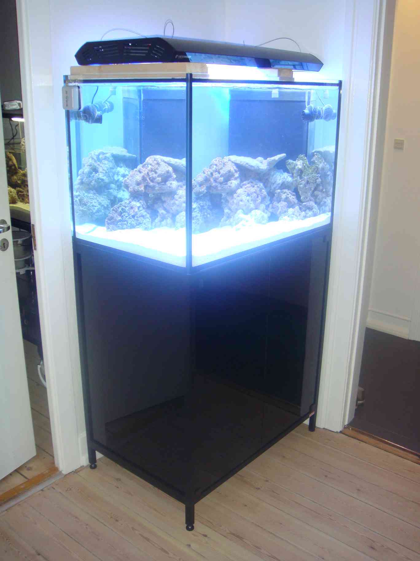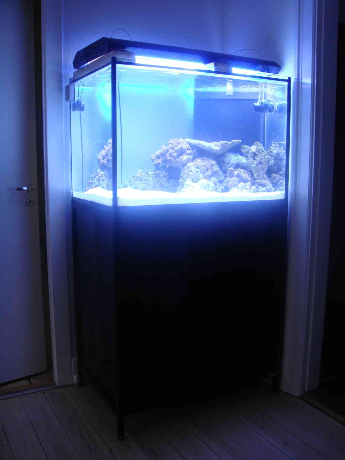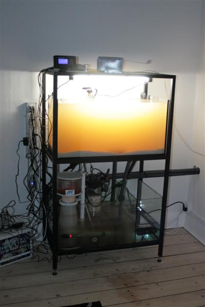 Teknik er ved dette setup ret begrænset da der føres diverse rør og ledninger ind i rummet bag akvariet via 3 huller der bores i væggen. Så som udgangspunkt er der kun: