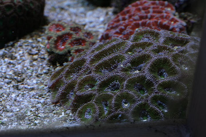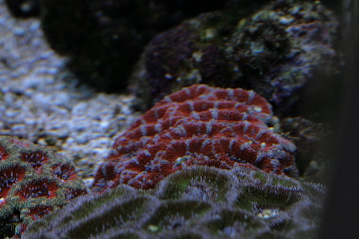 Man kan ane min røde aussie scolymia og skriggrønne Tracophyllia i bunden af billedet.