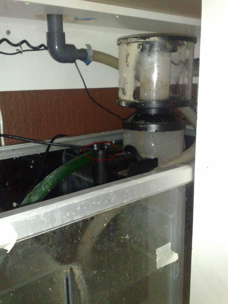 jeg tror dit problem er at pumpen giver for meget vand du skal montere er hane på slangen så du kan regulere vandmængden eller klemme slangen lidt sammen evt med en lille skruetvinge. jeg kan se på billede at din vandstand i skummer koppen er alt for høj den skal ned lige i underkanten af skummerkoppen så der kun er skum i selve skummerkoppen