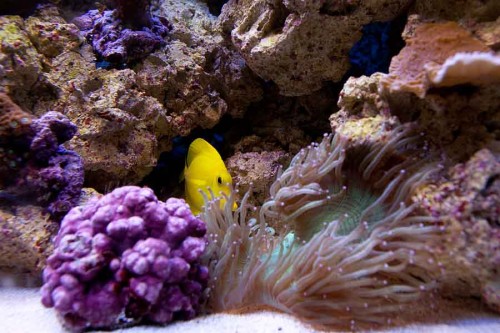 Min søanemone holder igen flyttedag, Den landede i den anden ende af akvariet, og i øjeblikket er den ude af syne gemt bag stenopsætningen.