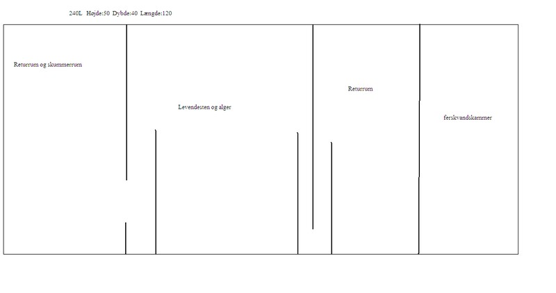 jeg har lige fået mit 240L akvarie som skal bruges til sump. Baljen over er på 500L Er meget i tvivel om opdelingen og rummenes størrelse samt placeringen af skummer. Hælder lidt til at dele den op i 4 store rum. Ved bare ikke hvor jeg skal smide min skummer. Det er en hea 150 jeg har. Der følger en lille pumpe med til fodring, men synes det ville være fedt hvis nu jeg brugte et hul fra baljen til fodringen af den. Gør jeg det skal jeg så ikke have en kuglehane på nedløbet til den? Fodre jeg den fra det rigtige nedløb skal jeg vel også have en kuglehane på. Hvad giver det bedste resultat af de 3 muligheder? Jeg kan læse mig frem til der er nogen der har alger i deres sump, giver det ekstra plus point til baljen? Hvis der skal alger i ville det ikke være en fordel at smide dem i det midterste rum og så placere skummeren i første rum? Havde lidt tænkt mig opbygningen skulle se sådan her ud.