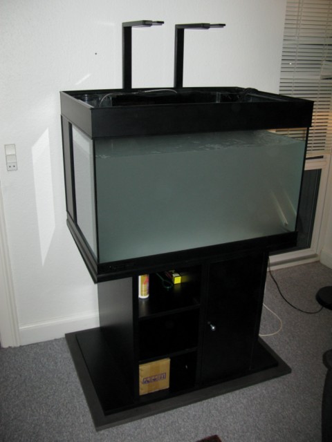 Jeg har også fået købt et 4 trins osmoseanlæg fra saltvandsbutikken som er blevet brugt flittigt til at fylde akvariet over de foregående dage. Jeg blandede salt i tirsdag d. 6 april og hentede sten købt brugt i går d. 7 april. Det var nogle kanon flotte og porøse sten omend store, så det var noget af et puslespil at få dem lirket ned i akvariet. Men synes det er lykkedes nogenlunde. Nu skal jeg bare gå og kigge på det de næste dag og se om jeg er tilfreds. I er mere end velkomne til at komme med jeres input til min stensætning.