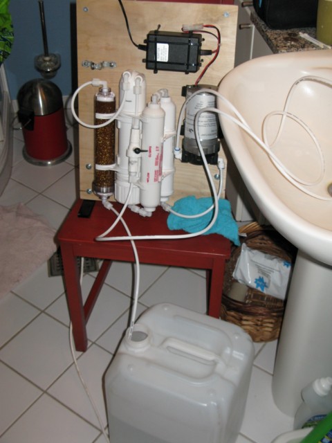 Jeg har også fået købt et 4 trins osmoseanlæg fra saltvandsbutikken som er blevet brugt flittigt til at fylde akvariet over de foregående dage. Jeg blandede salt i tirsdag d. 6 april og hentede sten købt brugt i går d. 7 april. Det var nogle kanon flotte og porøse sten omend store, så det var noget af et puslespil at få dem lirket ned i akvariet. Men synes det er lykkedes nogenlunde. Nu skal jeg bare gå og kigge på det de næste dag og se om jeg er tilfreds. I er mere end velkomne til at komme med jeres input til min stensætning.