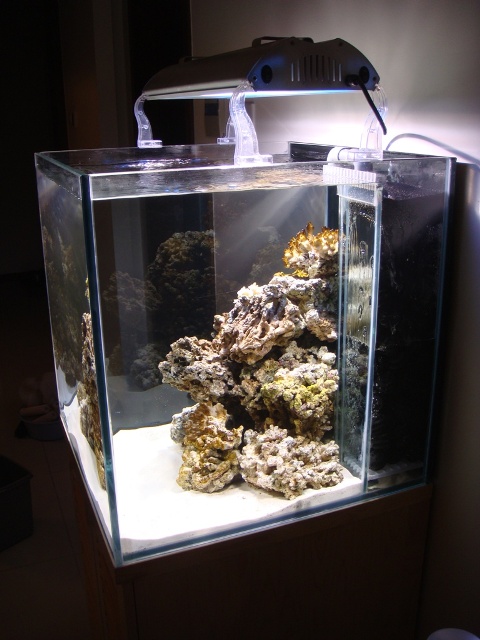 Jeg regner egentligt ikke med at der skal saa mange fisk i akvariet til den tid. Et par klovne fisk og lidt andet. Men vil derimod gerne have 10-15-20 koraller i, alt efter hvad de fylder hen af vejen.