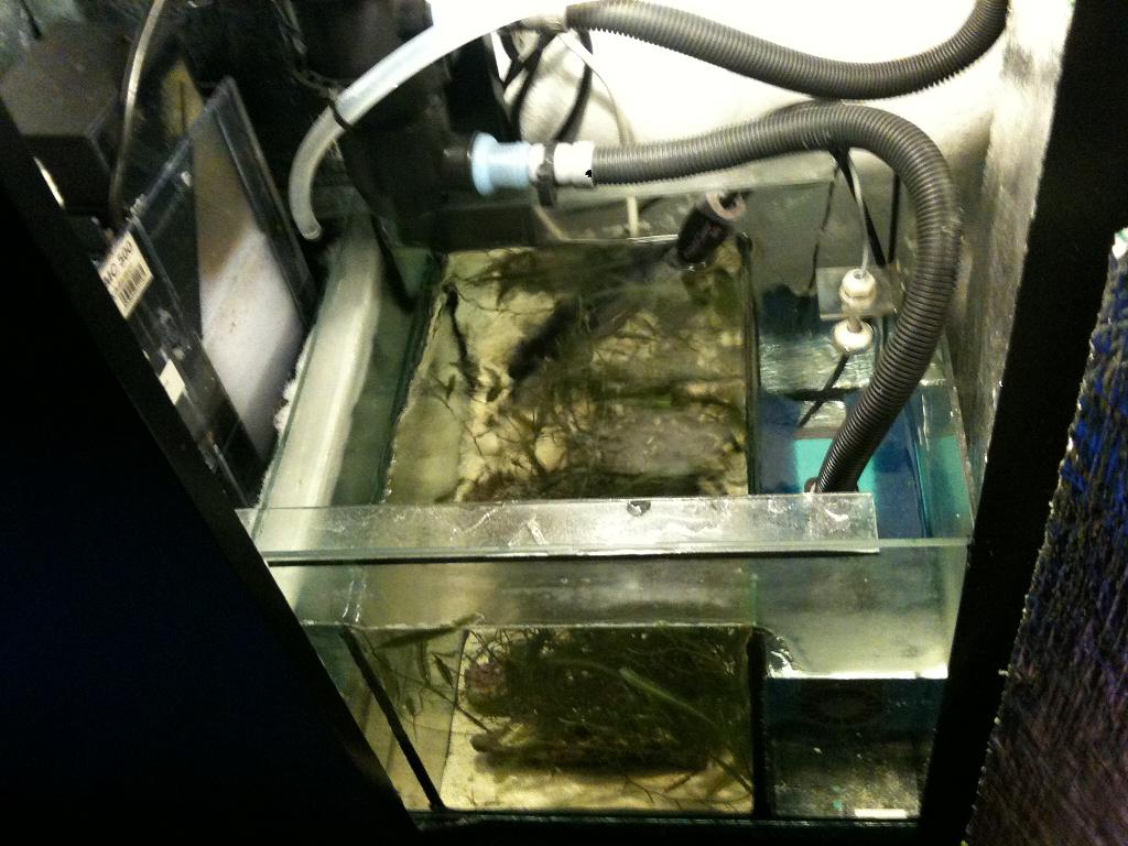 Sumpen er indelt i 3 rum: nedløb med deltec mc 500 og bobbelfælde hvori jeg har filtervat og en blå svamp, refugium med calurpa alger der har lys 24/7, og returkammer med new jet 1700.