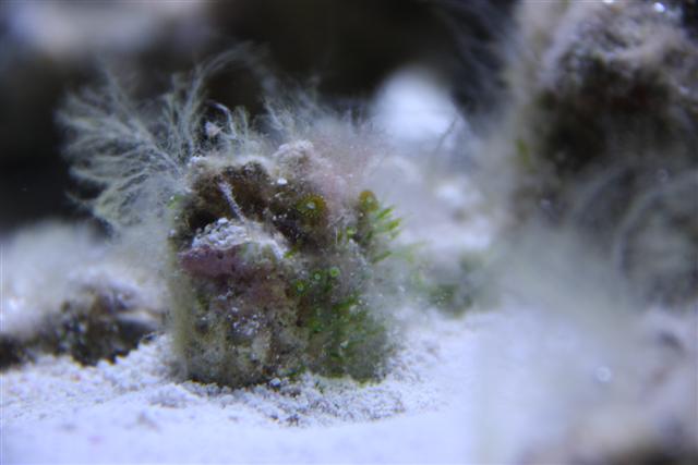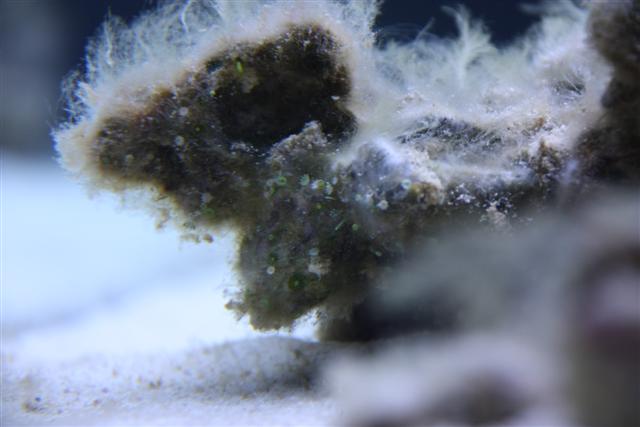 Hej, der er et par forskellige ting på mine LS som jeg ik helt ved hva er og da jeg har købt stenene brugt og ved der tidligere har været hydroider på nogle af dem, vil jeg lige sikre mig det ik er dem der er vendt tilbage, for så ska jeg da til at igang. Akvariet har kørt i 5 uger efter opstart. Billederne er ik alt for gode, men kan ik gøre det bedre før jeg får en anden linse. Det ligner nærmest grønne og hvide blomster som sidder på en grøn stengel, dem er der en del af, og så er der nogle andre alger som nærmest er bladformede og ender i et y. Udover dem har jeg os lidt neomeris, men de er vel ingen skade til el?