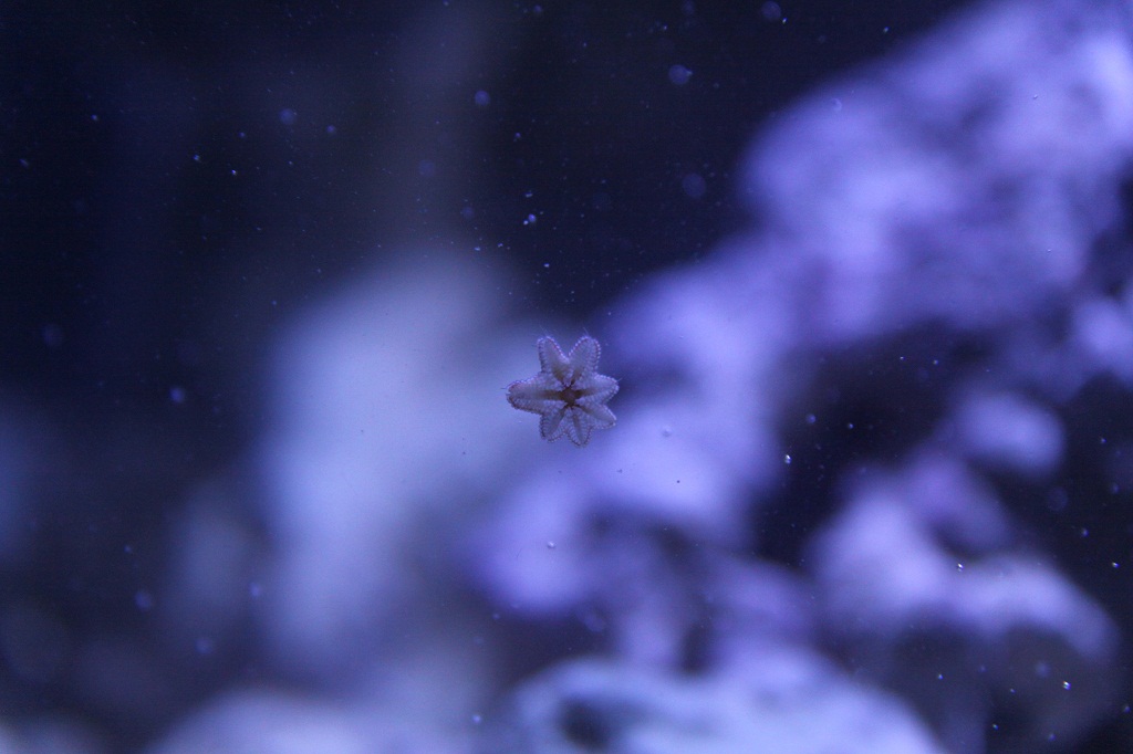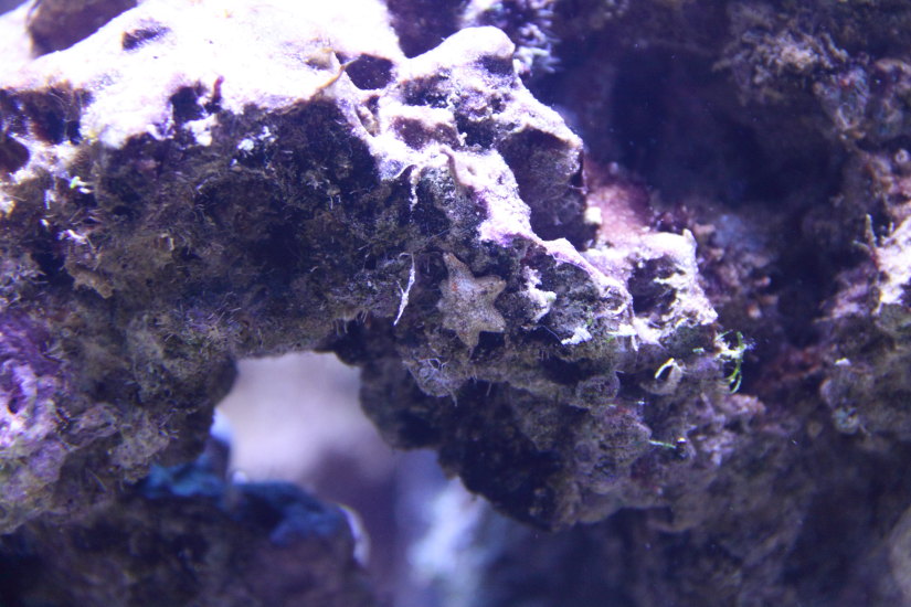 Der er lidt grønne og bruge alger (tror jeg, se billeder og video), ud over det har jeg observeret 7 - 8 søstjerner, nogle lange nærmest tråde / arme der kommer ud af div rør i stenene, de står ligesom og svajer lidt for lige pludselig at trække sig ind, så lidt liv er der.