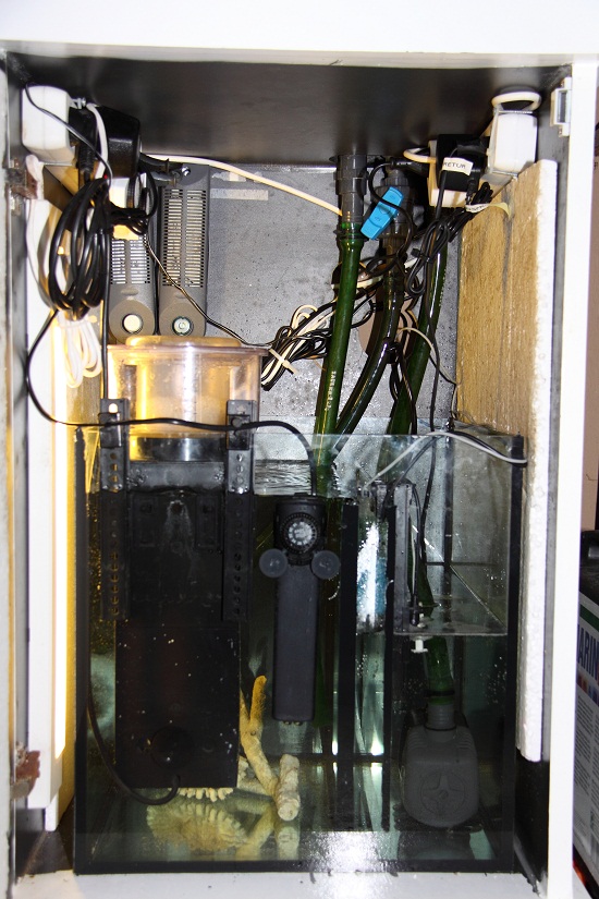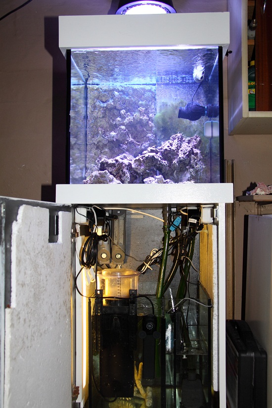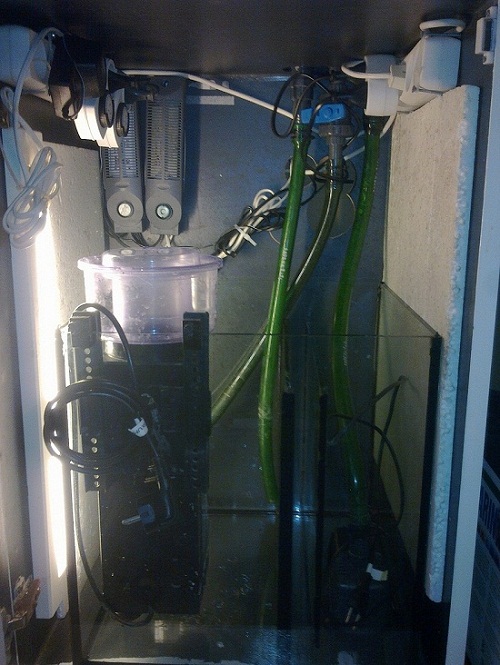 Jeg mangler stadig en sump 40X40X40, havde egentlig fundet en i akryl, men tør sku ikke løbe chancen, skummer er sat direkte i akvariet (shit den fylder), lys er sat op, osmose er nødtørftigt sat til.