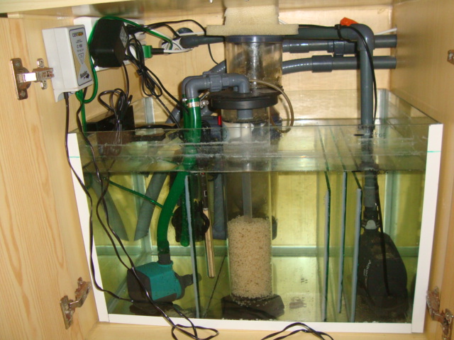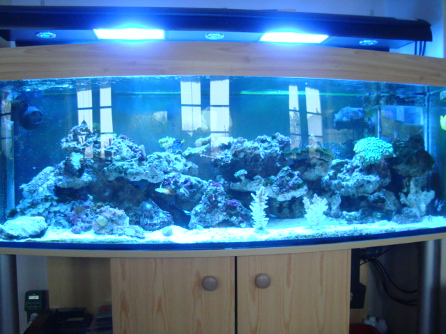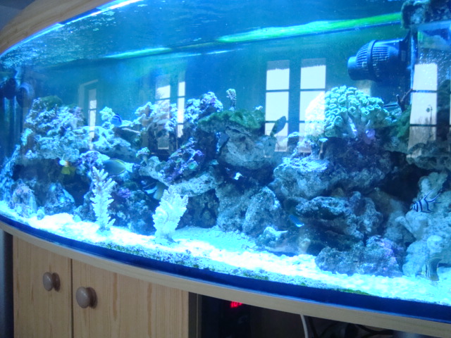 Jeg startede med ferskvand for 10 år siden og sluttede af med malawi-chichlider for 3 år siden og har siden ikke haft vand i stuen. Jeg har nu fået lidt mere tid igen og denne gang skulle det så være saltvand der skulle indefor at stå. Jeg startede med et 250L for 1½ mdr siden og kunne med det samme se at det var sq for småt. Der er nu indkøbt et 450L og alle LS fra 250L + 65 kg LS er blevet lagt over i, sammen med vandet fra 250L.