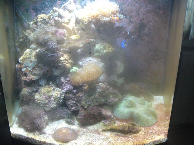 Super. Til start vil jeg råde dig til og lade være med at skifte så meget vand på en gang. Du har sikkert vildt mange brune alger både på sten og glas. Skift kun 10 liter i ugen. Smid din skummer langt væk og køb en luft skummer der passer i kammeret. Spørg til råds herinde, men jeg vil anbefale dig en http://akvarieudstyr.dk/Saltvand/Skumme ... digskummer og husk luft på ca 200.