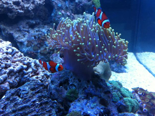 Med hensyn til mine klovne så går de begge i anemonen nu men tror ikk helt de har dannet par så den ene blir til tider jaget ud..
