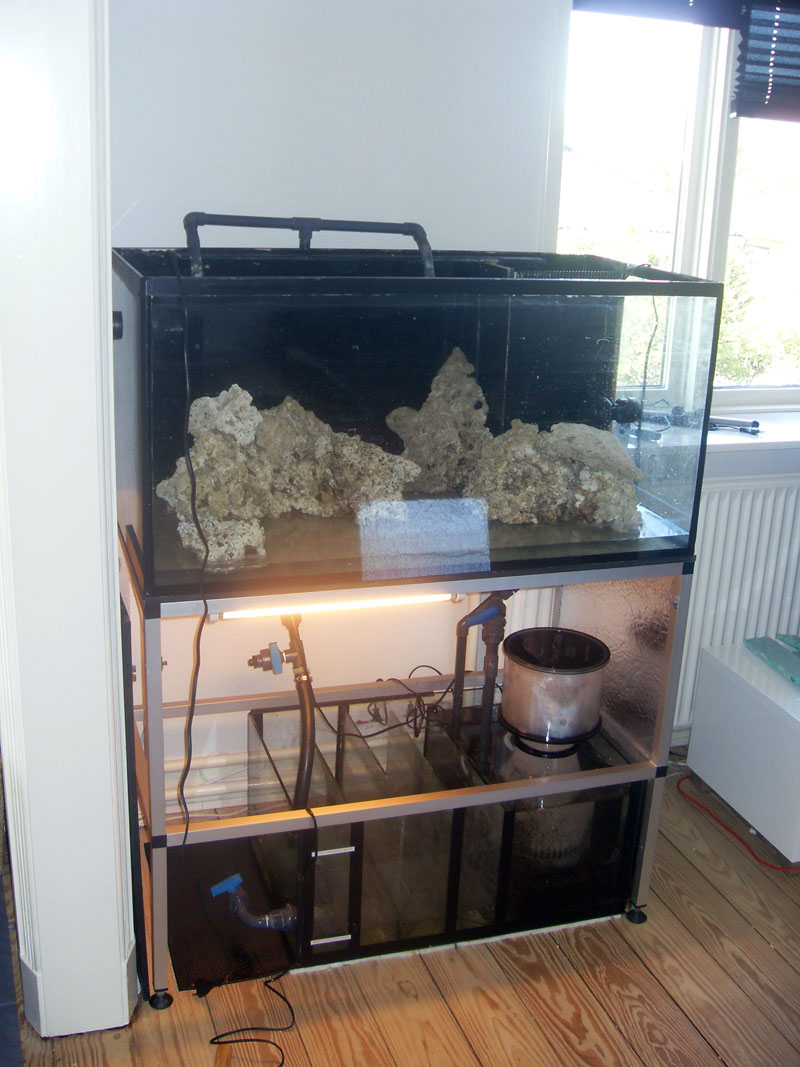 Efter snart 6 måneders læsen og undersøgen fik jeg endelig modet på at få købt mig et akvarie. Jeg havde forelsket mig i shallow reefs, kombineret af ”halvøer” og øer; som en slags laguner under vand. Da dagen kom blev det et 250L (100x50x50), på et porsa stel, med hjemmelavet skabsplader i 12mm MDF plader. (Tak til Buddy for at sælge sit gamle akvarie)