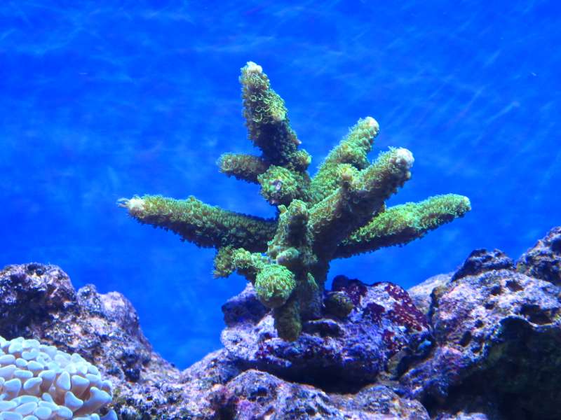 Mikas når den står i fuld flor har den polypperne helt ude, og det er i denne position den med glæde tager imod foder. Jeg sætter lige et billed ind af mit gamle akvarie hvor min gamle solkoral står helt ude i højre side med sine polypper helt ude (den er gul), og sådan stod min 5-10 min. efter fodring af fisk, men det meste af tiden havde min trukket polypperne helt ind, dog havde den polypperne helt ude om natten hvor den også kunne fodres.