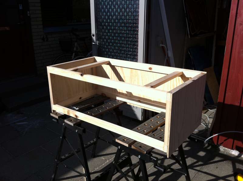 Bord - Porsa understel, som beklædes med hvide plader. Det gamle skab var godt lydisoleret indvendigt, så disse plader har jeg også genbrugt.