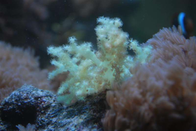 Ja, det er ikke nemt at se, enten en Seriatopora som Anders skriver, eller det kan også være en poccilliopora en blødkoral? Prøv at stik en fingeren i den, er den hård/blød. Hvordan ser den ud uden tentakler ude