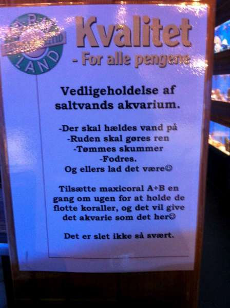 De sidste 2 gange har jeg bare været derinde for, at ose lidt og købe lidt til hundene. Den ene gang var der nærmest ikke noget i nogle af akvarierne, men det er vel fair nok, hvis der er varer på vej... Gangen efter lå der temmelig mange døde fisk, især helt små klovne... Men der kan jo altså komme sygdom i skidtet. Umiddelbart så det ud til, at de også havde lidt bøvl med evt. Cyano... Ovenstående kan ikke jage mig væk som kunde, men jeg gider nok ikke komme alt for mange gange, hvis det bliver ved med at være sådan... Indtil da satser jeg på, at jeg bare har været der på nogle uheldige tidspunkter...