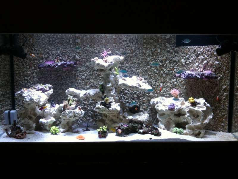 Da akvariet ikke er dybere end 50cm har jeg valgt primært at benytte keramik søjler fremfor levende sten da det sidste ville optage for meget plads, da der ikke er så meget dybde at give af. Jeg har samtidig sat keramik baggrund i akvariet da jeg med 100% sikkerhed ved at jeg ikke vil kunne holde bagruden ren over en længere periode. Jeg har tilføjet de levende sten fra mit gamle akvarie samt et par extra for at pode keramikken i det nye akvarie.